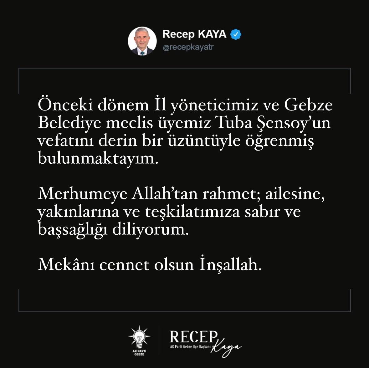 “Önceki dönem İl yöneticimiz ve Gebze Belediye meclis üyemiz Tuba Şensoy’un vefatını derin bir üzüntüyle öğrenmiş bulunmaktayım. Merhumeye Allah’tan rahmet; ailesine, yakınlarına ve teşkilatımıza sabır ve başsağlığı diliyorum.